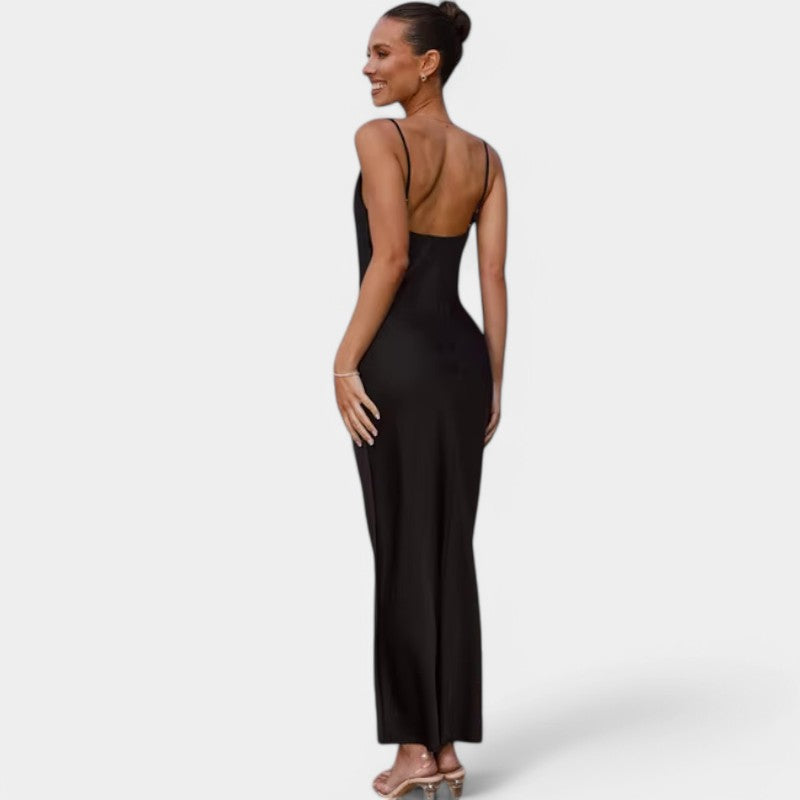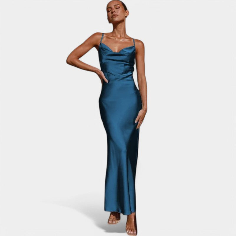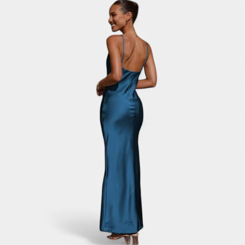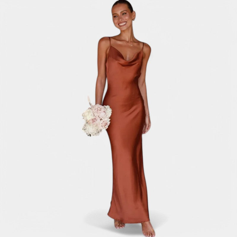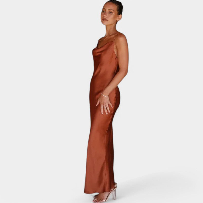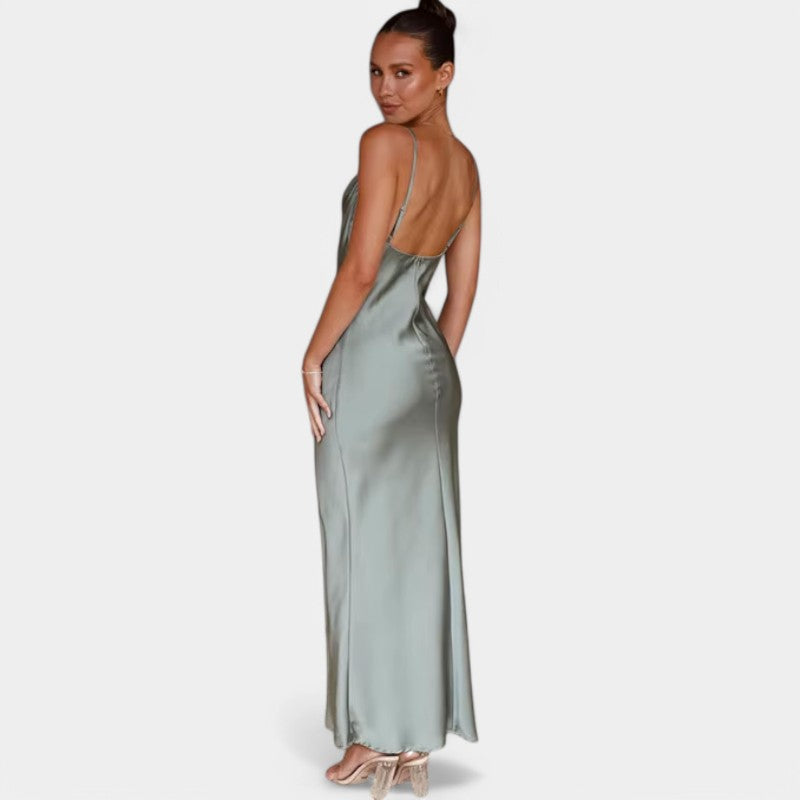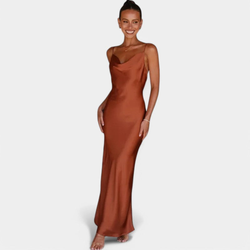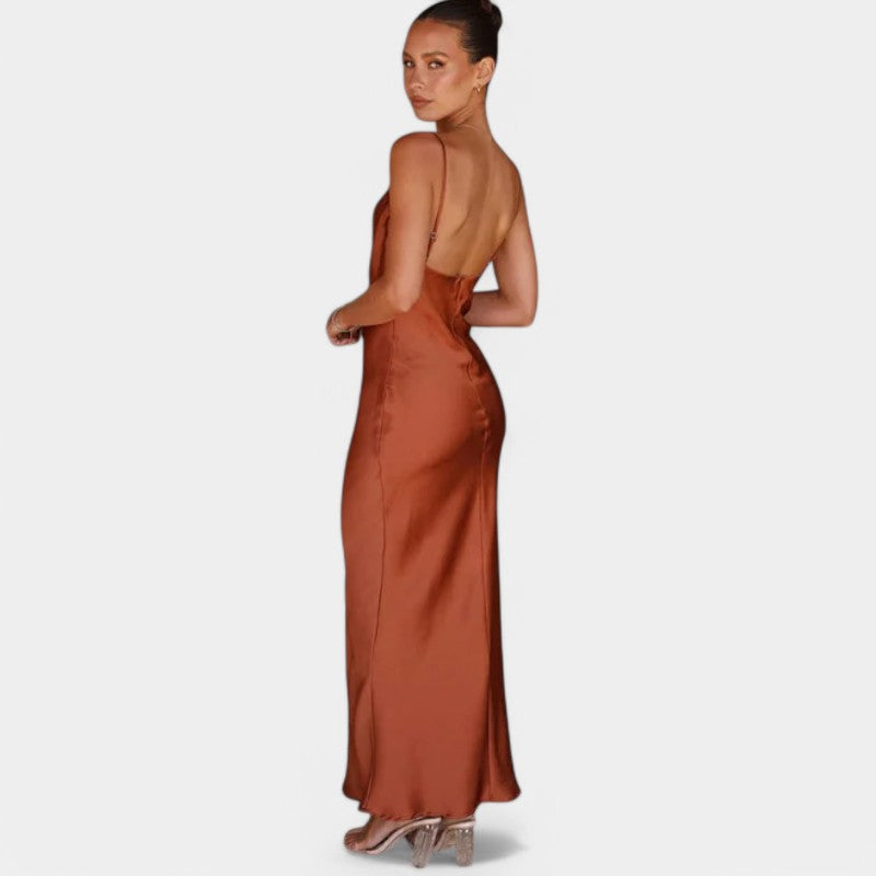 Deze satijnen maxi-jurk biedt de perfecte balans tussen verfijning en sensualiteit. Het glanzende materiaal en de gedrapeerde details creëren een luxe uitstraling, terwijl de open rug en de eenvoudige snit een moderne en elegante twist geven. Verkrijgbaar in warme tinten zoals brons en zacht groen, is deze jurk een must-have voor bruiloften, gala's of chique avonden.